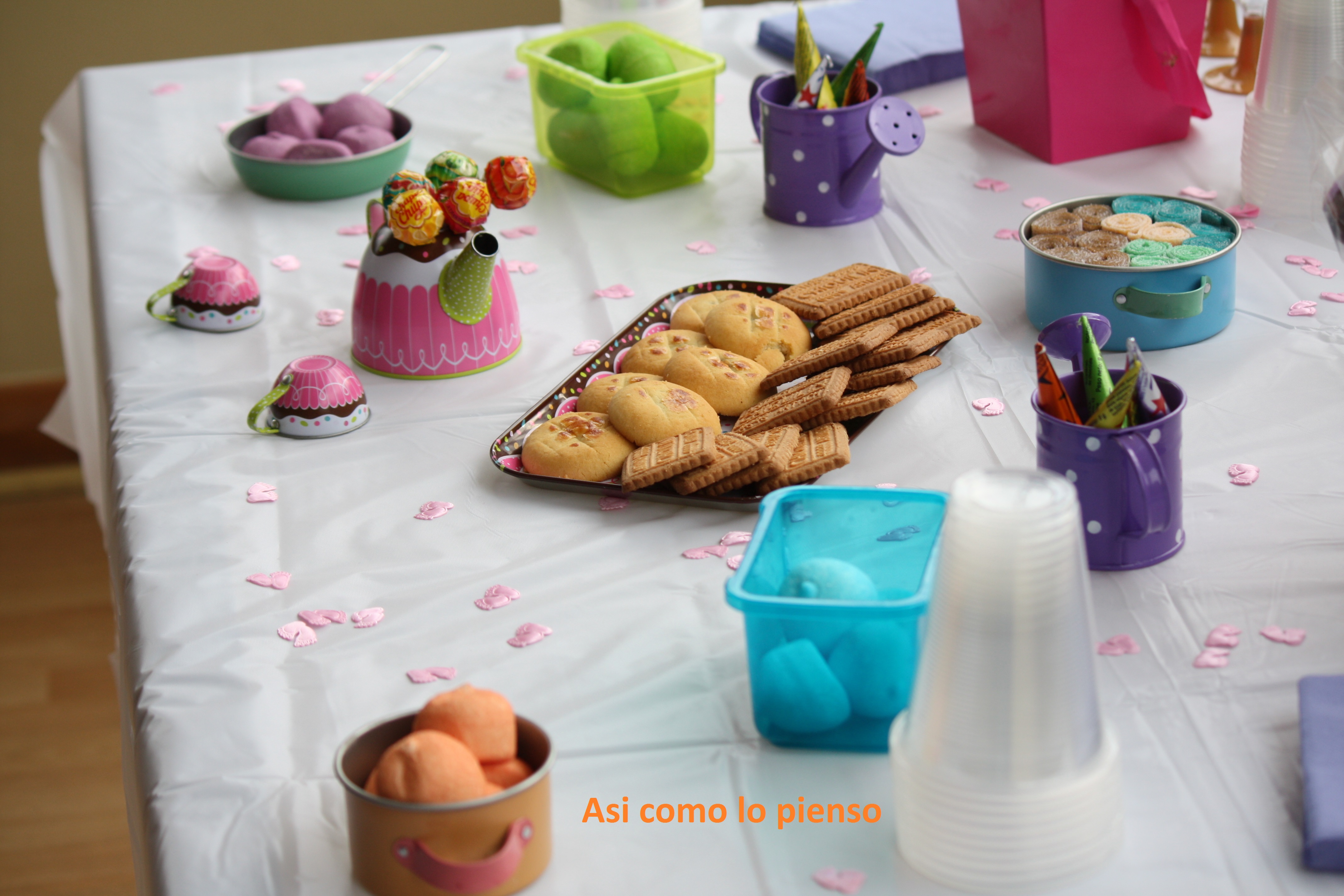También les teníamos mesa de dulces. Utilicé juguetes de cocina de mis hijas para poner las cosas y así darle un toque «infantil» al encuentro. Aquí algunas fotos: